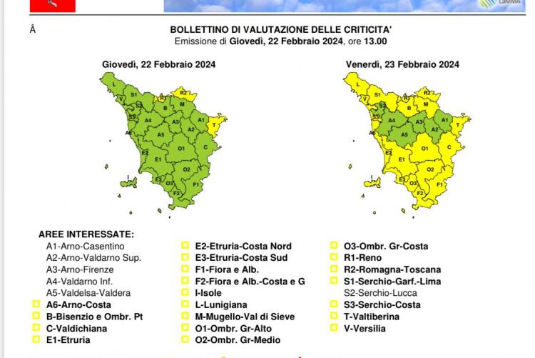 9 Febbraio 2024 Codice giallo per rischio idrogeologico/idraulico dalle ore 20 di venerdì 9 alla mezzanotte di sabato 10 febbraio