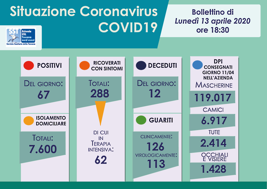 Per quanto riguarda i ricoveri per “Covid-19”, inoltre, ad oggi sono in totale - negli ospedali dell’Azienda USL Toscana nord ovest - 288 di cui 62 in Terapia intensiva.