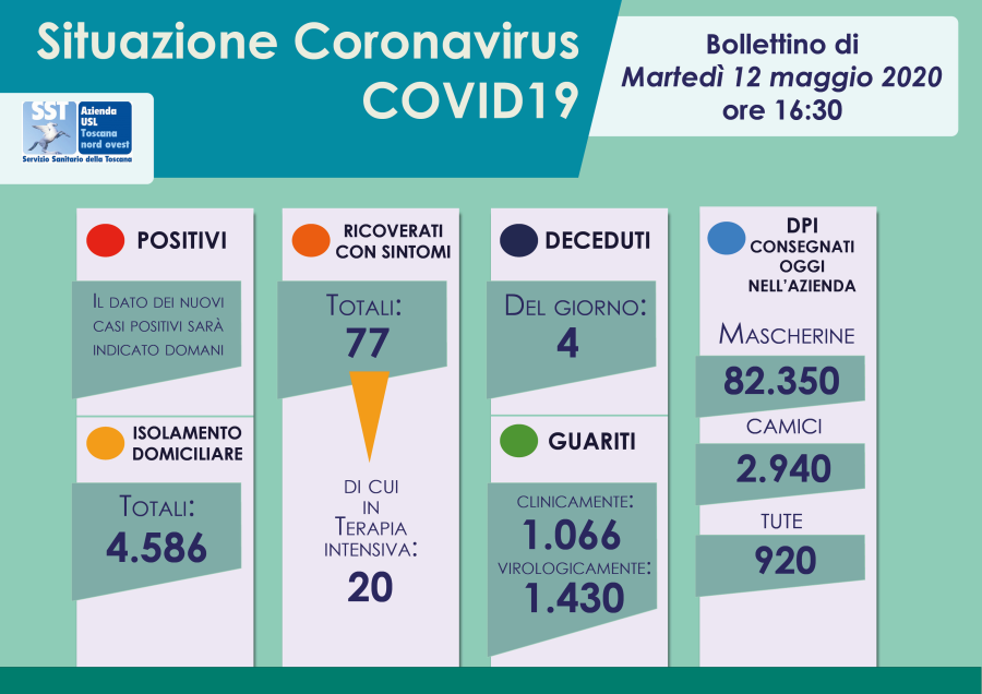 Come anticipato nei giorni scorsi, nella comunicazione di oggi (martedì 12 maggio 2020), riportiamo esclusivamente le informazioni su guariti, decessi e persone in isolamento domiciliare.