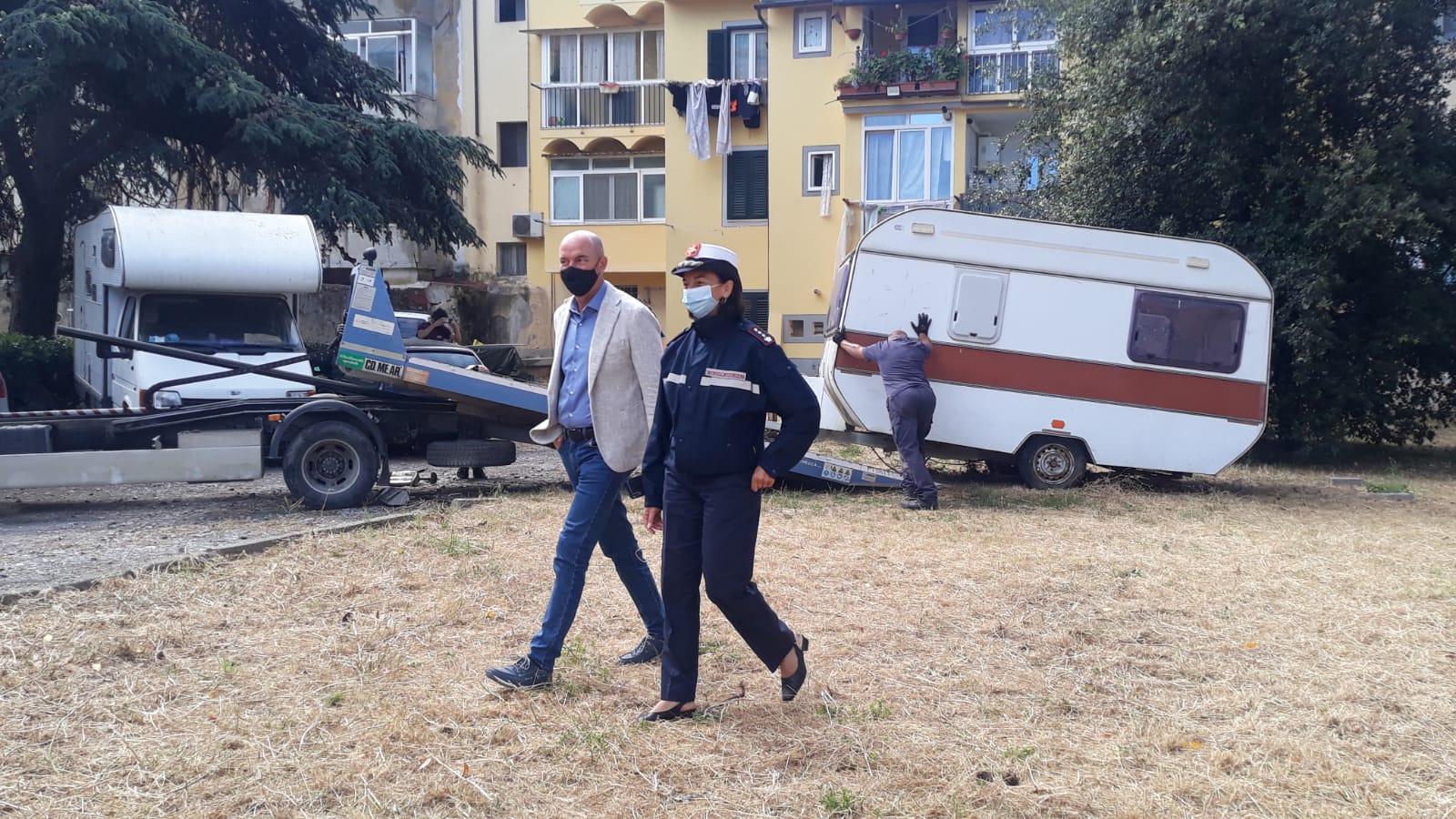 La Polizia Municipale ha provveduto a rimuovere una roulotte vandalizzata e abbandonata da anni nel prato dell'area condominiale di Casalp oggetto dei lavori di decoro.