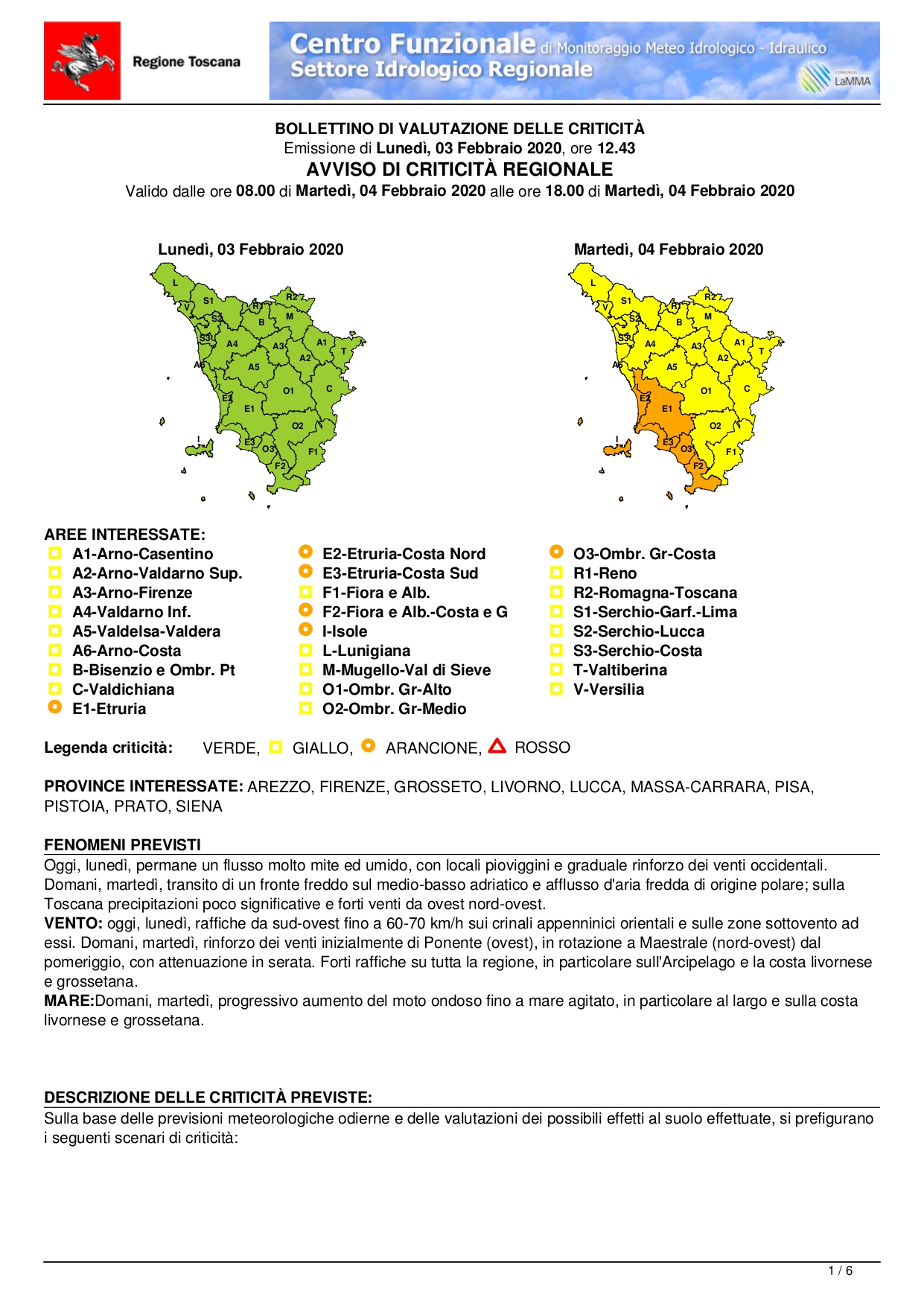 allerta arancione dalle ore 8 alle 18 di martedì 4, sempre per il forte vento.