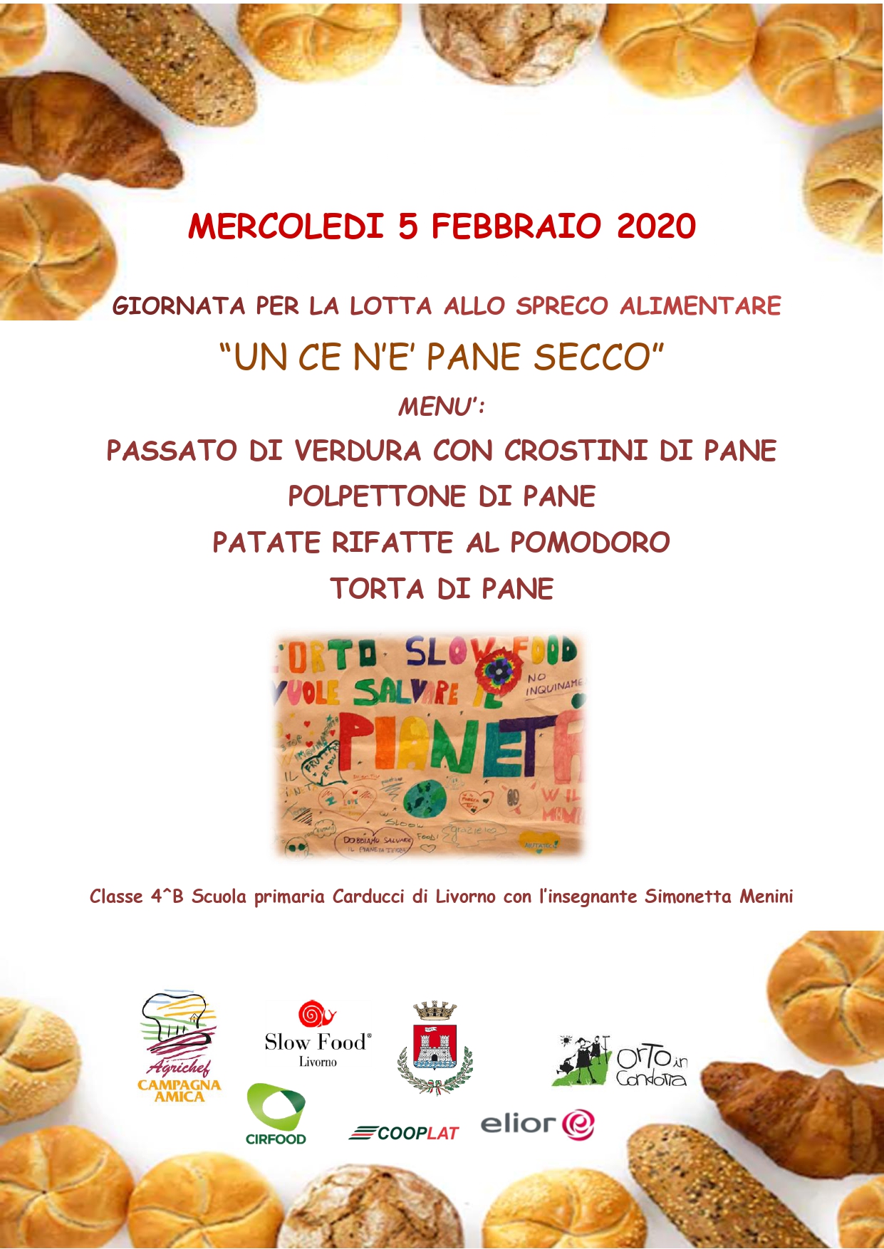 Un menù davvero speciale dal nome tutto livornese “ Un ce n’è pane secco“, proprio perché vede come protagonista il pane , principalmente raffermo, utilizzato in tante ricette perché non si butta via niente . L’idea del menù nasce da un progetto elaborato dalla classe IV B della scuola primaria Carducci, in collaborazione con Slow Food e Bottega di Campagna Amica che ha visto la realizzazione di un opuscolo, intitolato appunto “Un ce n’è pane secco” con tante ricette a base di pane; un ricettario che tra l’altro riporta al suo interno un “barbatrucchi” per la conservazione e il riutilizzo del pane .