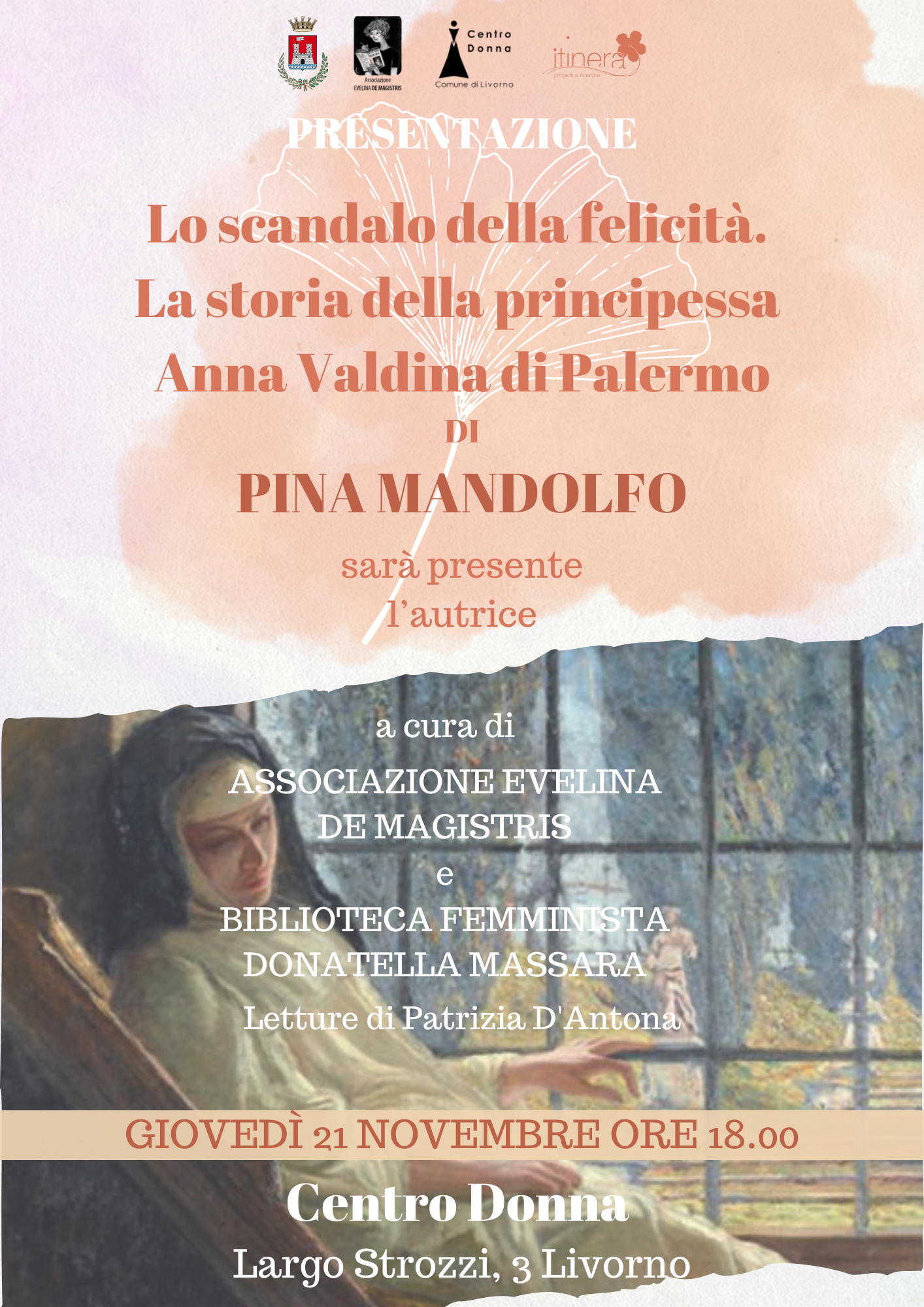 Livorno, 19 novembre 2024 – Giovedì 21 novembre alle ore 18 nei locali del Centro Donna del Comune di Livorno (largo Strozzi, 3) verrà presentato il volume di Pina Mandolfo “Lo scandalo della felicità. La storia della principessa Anna Valdina di Palermo” (Vanda edizioni 2023). Interverrà l’autrice. Lettura di Patrizia D’Antona.