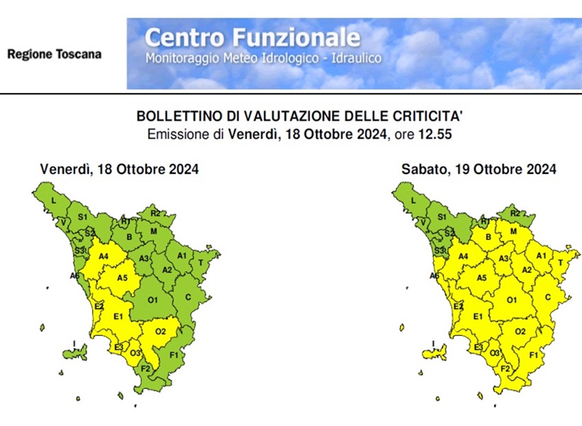 Livorno, 18 ottobre 2024 – Il Centro funzionale meteo della Protezione civile regionale ha disposto il codice giallo per rischio idrogeologico e idraulico del reticolo minore su gran parte del territorio della Toscana, a causa della circolazione depressionaria presente sul Mediterraneo centrale che nelle prossime ore tornerà ad interessare la nostra regione con piogge diffuse e cumulati medi ovunque significativi.