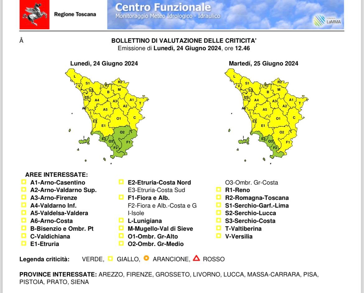 Livorno, 24 giugno 2024 – La Sala operativa della Protezione civile regionale ha emesso un bollettino di codice giallo per le giornate di oggi e domani nelle quali sono previste condizioni meteo di marcata instabilità con frequenti rovesci e temporali.
