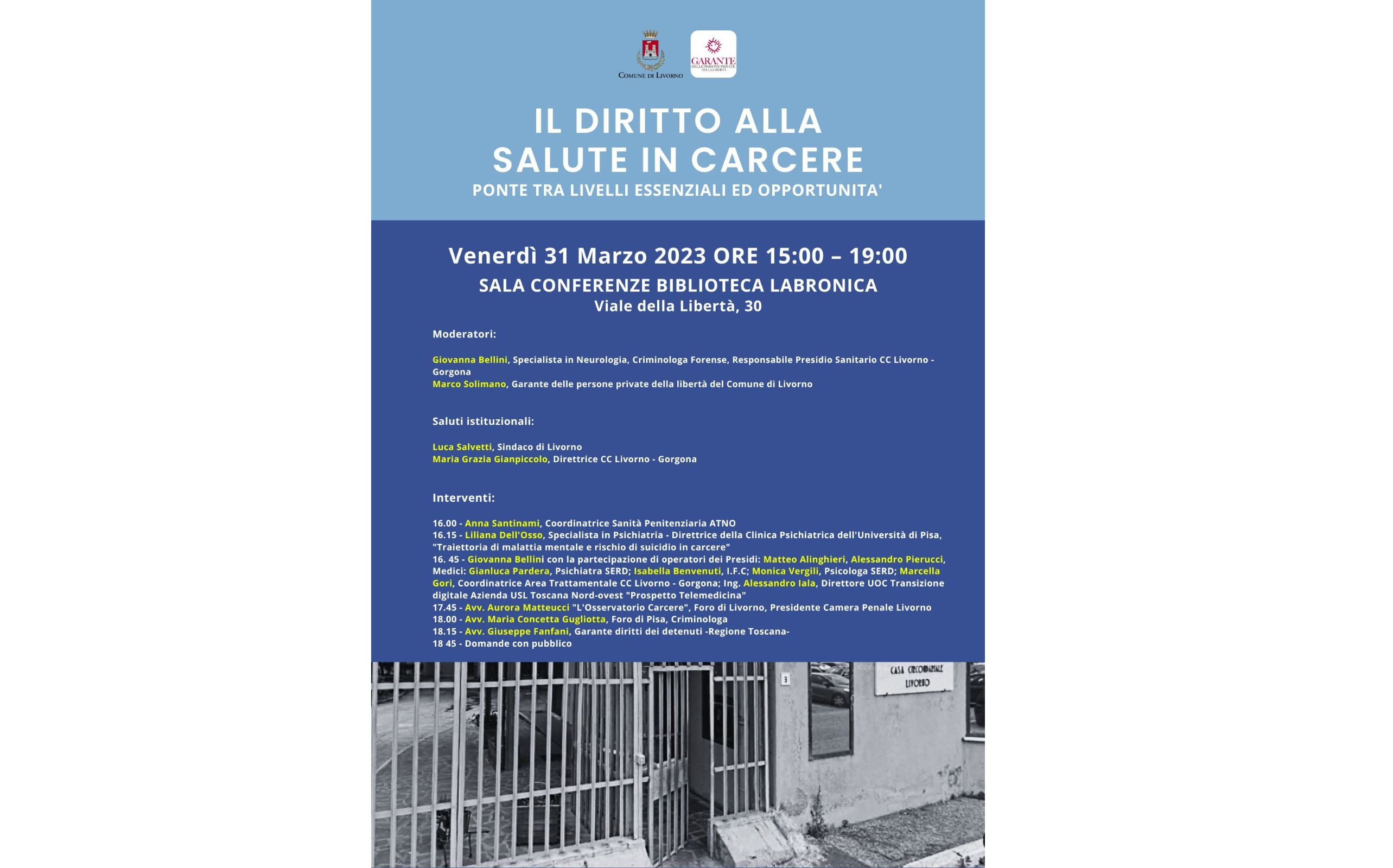 L’iniziativa è organizzata dal Garante delle persone private della libertà personale del Comune del Comune di Livorno, Marco Solimano, che modererà gli interventi insieme alla dottoressa Giovanna Bellini, specialista in Neurologia e Criminologia Forense, responsabile del Presidio Sanitario della Casa Circondariale Livorno e Gorgona.