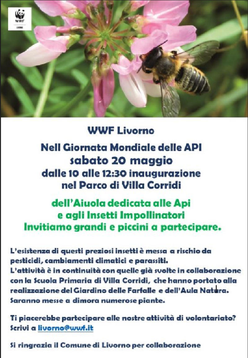Livorno, 18 maggio 2023 – Sabato 20 maggio in occasione della Giornata Mondiale delle Api nel parco di Villa Corridi alle ore 10 sarà inaugurata l’aiuola dedicata a questi preziosi insetti e agli altri impollinatori e allo stesso tempo saranno messe a dimora altre piante "rustiche" con modeste esigenze idriche.