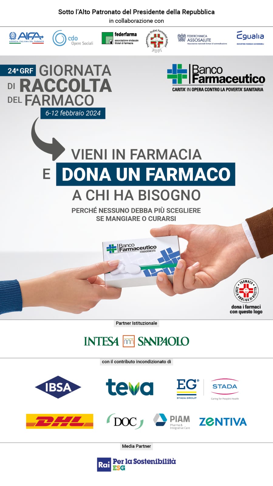 La Giornata di Raccolta del Farmaco si svolge sotto l'Alto Patronato della Presidenza della Repubblica, con il patrocinio di AIFA e in collaborazione con il Cdo Opere Sociali, Ferderfarma, Fofi, Federchimica, Assosalute, Egualia-Industrie Farmaci Accessibili, Intesa San Paolo è Partner Istituzionale dell'iniziativa. La GFR è realizzata grazie all'importante contributo di IBSA Italy, Teva Italia, EG Stada Group e DHL Supply Chain Italia e al sostegno di DOC Generici, Accord Healthcare, Piam Farmaceutici, Zentiva Italia e Zuccari.