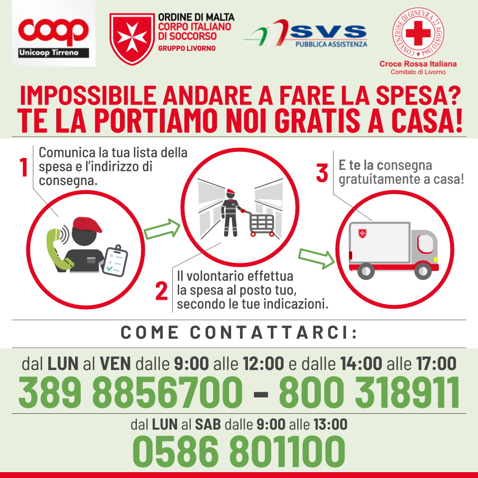 Le persone potranno fare richiesta di spesa a domicilio contattando: 389 8856700 dal lunedì a venerdì 9.00-12.00 14.17 800 318911 dal lunedì a domenica 9.00-18.00 0586 801100 da lunedì a sabato 9.00-13.00'.