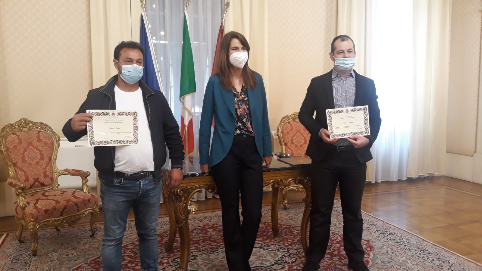 Ai due volontari è stata consegnata una pergamena come ringraziamento da parte dell'Amministrazione comunale a nome della città.