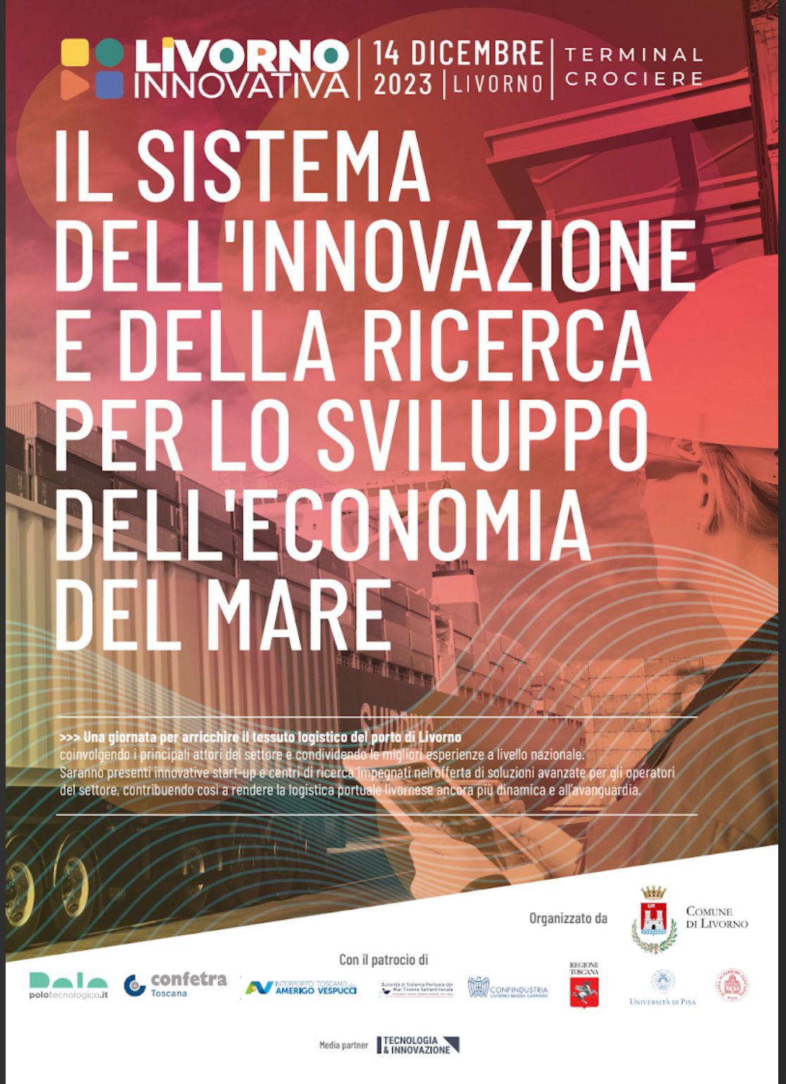 ”Livorno Innovativa. Il sistema dell’innovazione e della ricerca per lo sviluppo dell’economia del mare” ha ricevuto il patrocinio di: Regione Toscana, Università di Pisa, Scuola Superiore Sant’Anna di Pisa, Polo Tecnologico di Navacchio, Confetra Toscana, Interporto Amerigo Vespucci, Autorità di Sistema Portuale del Mar Tirreno Settentrionale e Confindustria di Livorno. Media partner è Tecnologia & Innovazione.