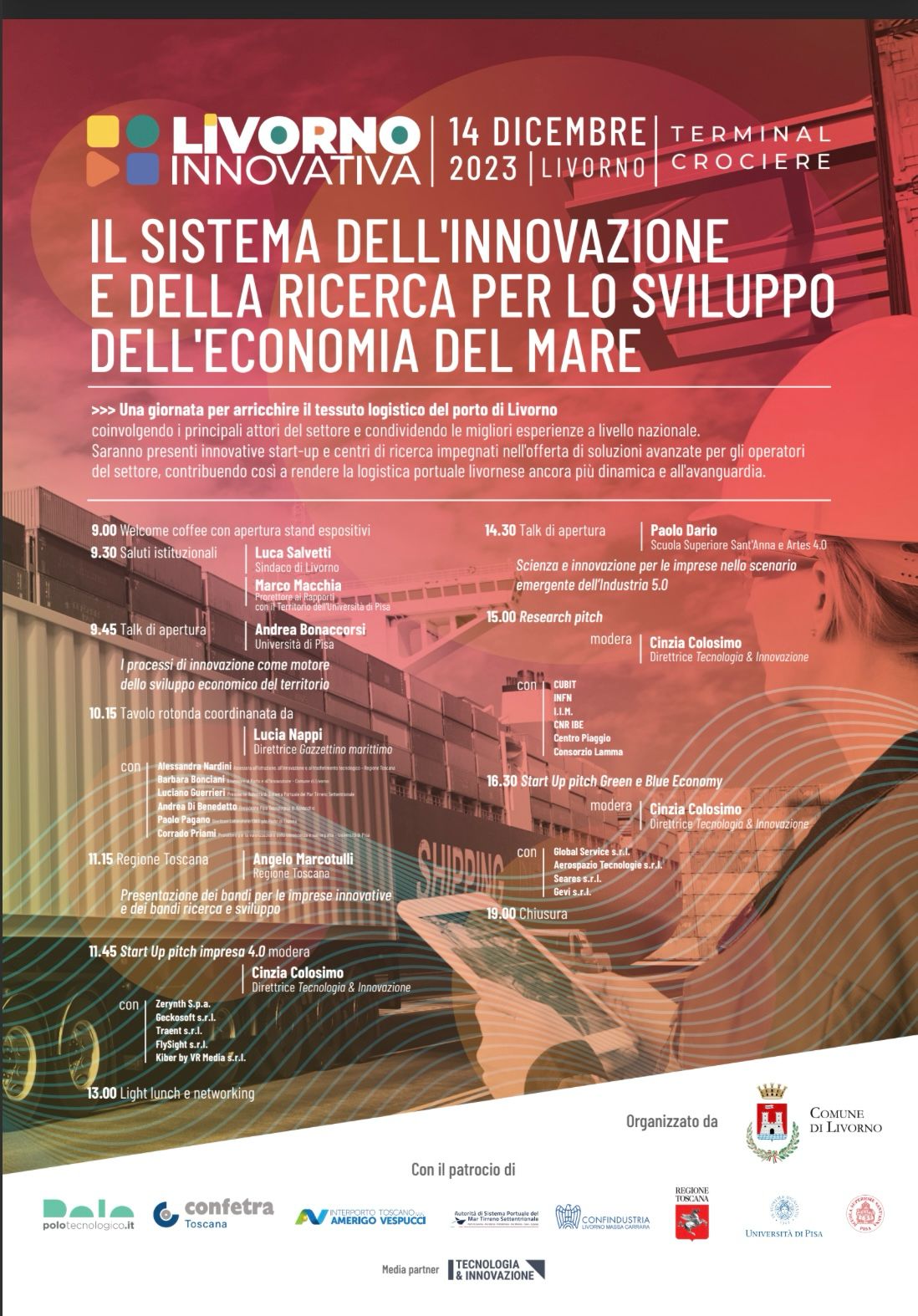 Il talk di apertura è affidato a Andrea Bonaccorsi, Università di Pisa, e verterà sul tema “I processi di innovazione come motore dello sviluppo economico del territorio” al quale seguirà una tavola rotonda che registrerà la presenza di Alessandra Nardini, assessora all'Istruzione, all'Innovazione e al Trasferimento tecnologico della Regione Toscana, Barbara Bonciani, assessora al Porto e all'Innovazione del Comune di Livorno, Luciano Guerrieri, presidente Autorità di Sistema Portuale del Mar Tirreno Settentrionale, Andrea Di Benedetto, presidente Polo Tecnologico di Navacchio, Paolo Pagano, direttore Laboratorio CNIT p/o Porto di Livorno e Corrado Priami, prorettore per la valorizzazione della conoscenza e suo impatto dell’Università di Pisa.