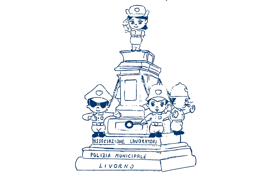 Si tratta di un bozzetto stile fumettistico realizzato dalla socia Catia Marabotti: lo schizzo rappresenta la statua dei Quattro Mori in maniera spiritosa. Al posto di Ferdinando dei Medici e dei Mori troviamo donne e uomini della Polizia Municipale in uniforme che vigilano sulla città.