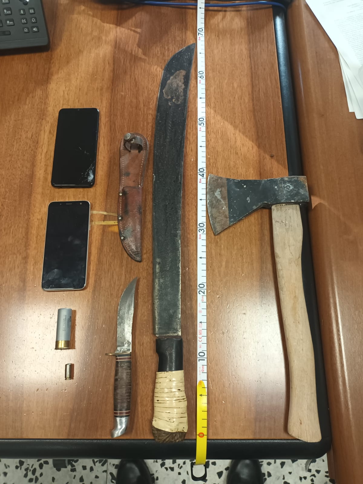 Nello specifico sono stati sequestrati circa 200 gr di sostanza stupefacente (hashish e cocaina), una somma di danaro provento di spaccio (€ 90), un macete, un'accetta, un coltello a lama fissa ed una cartuccia calibro 12.