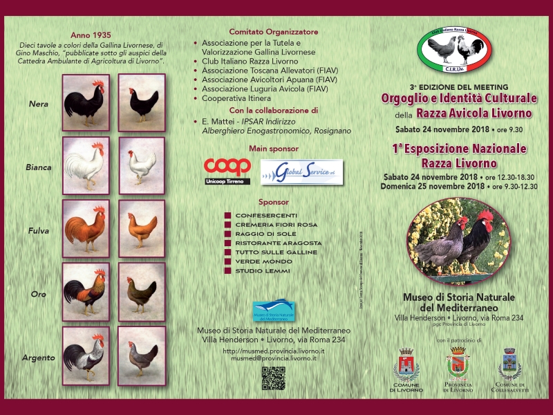 Livorno, 22 novembre 2018 – Livorno celebra la gallina razza “Leghorn” con due giorni di iniziative ed esposizioni che si svolgeranno sabato 24 e domenica 25 novembre al Museo di Storia Naturale del Mediterraneo a Villa Henderson (in via Roma 234).