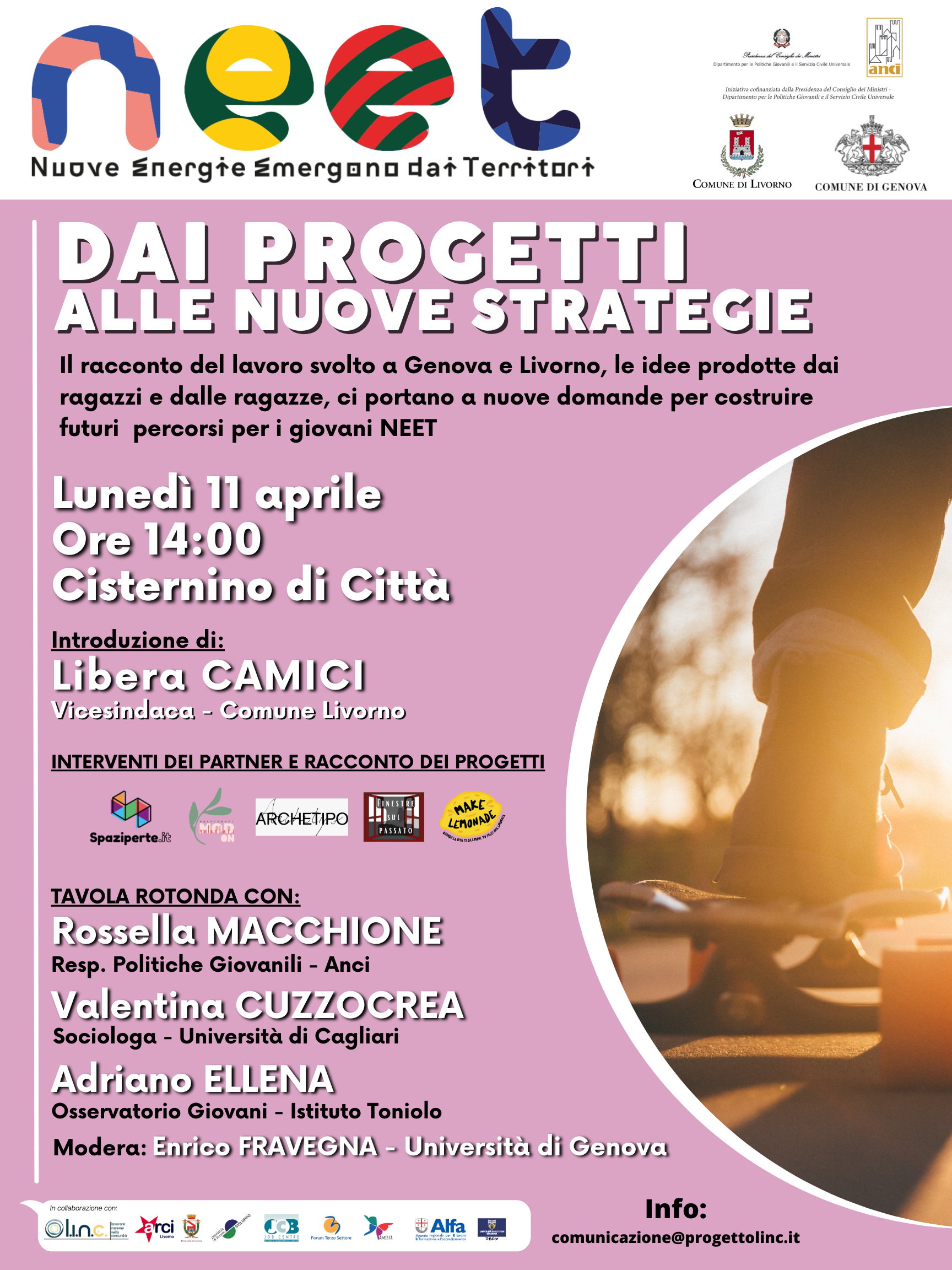 Lunedì prossimo 11 aprile alle ore 14 al Cisternino di Città si terrà un convegno dal titolo “Dai progetti alle nuove strategie. Il racconto del lavoro svolto a Genova e Livorno, le idee prodotte dai ragazzi e dalle ragazze, ci portano a nuove domande per costruire futuri percorsi per i giovani Neet”.