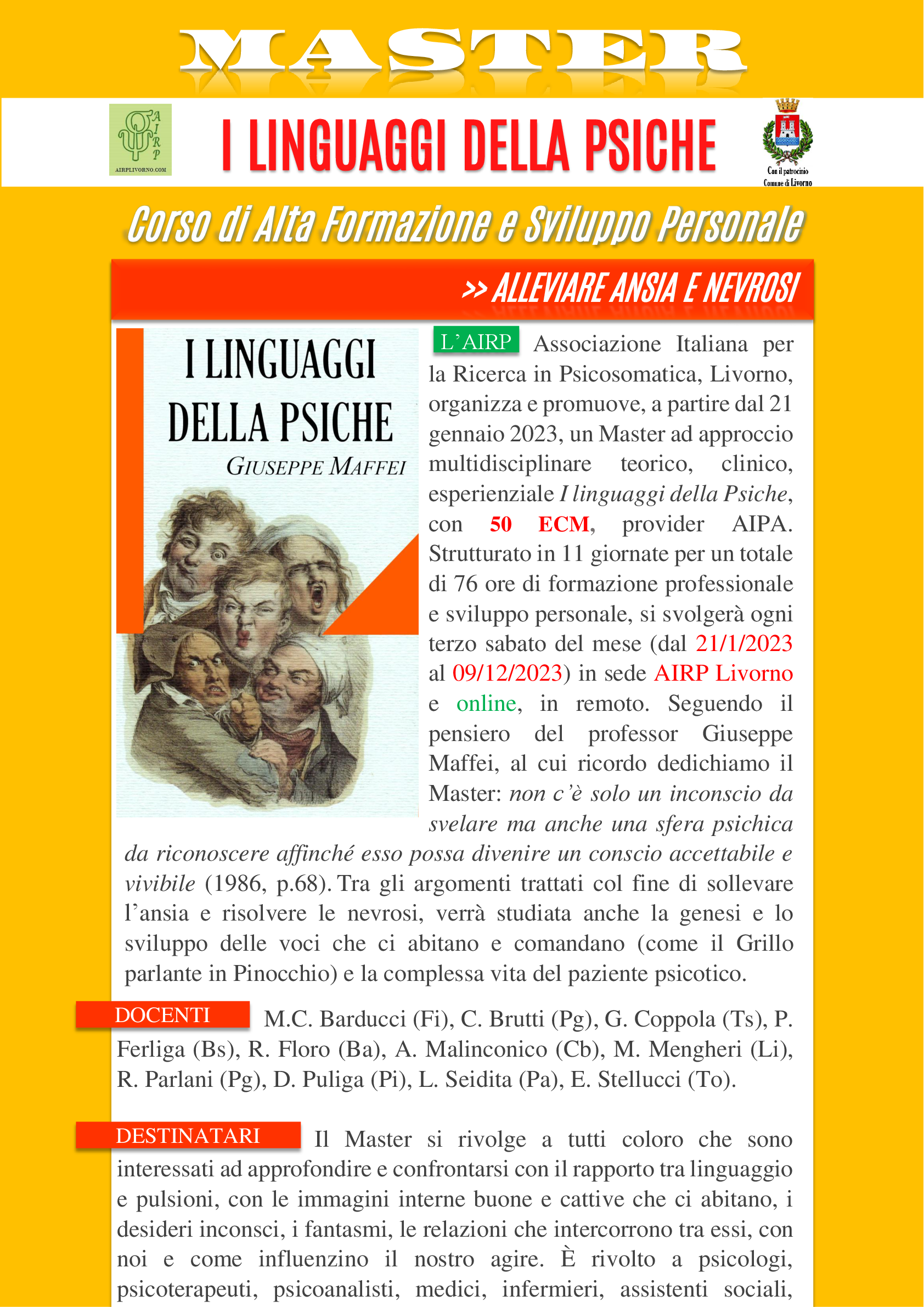 Livorno, 28 ottobre 2022 - Rimarranno aperte fino al 4 novembre le iscrizioni al Master "I linguaggi della pisiche. Corso di alta formazione e sviluppo personale" organizzato da AIRP ( Associazione Italiana per lo studio e la Ricerca in Psicosomatica ) con il patrocinio del Comune di Livorno.