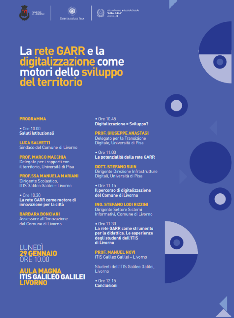 Livorno, 25 gennaio 2024 – Lunedì 29 gennaio dalle ore 10 l’aula magna dell’ITIS Galileo Galilei ospiterà un incontro dal titolo “La rete GARR e la digitalizzazione come motori dello sviluppo del territorio”.