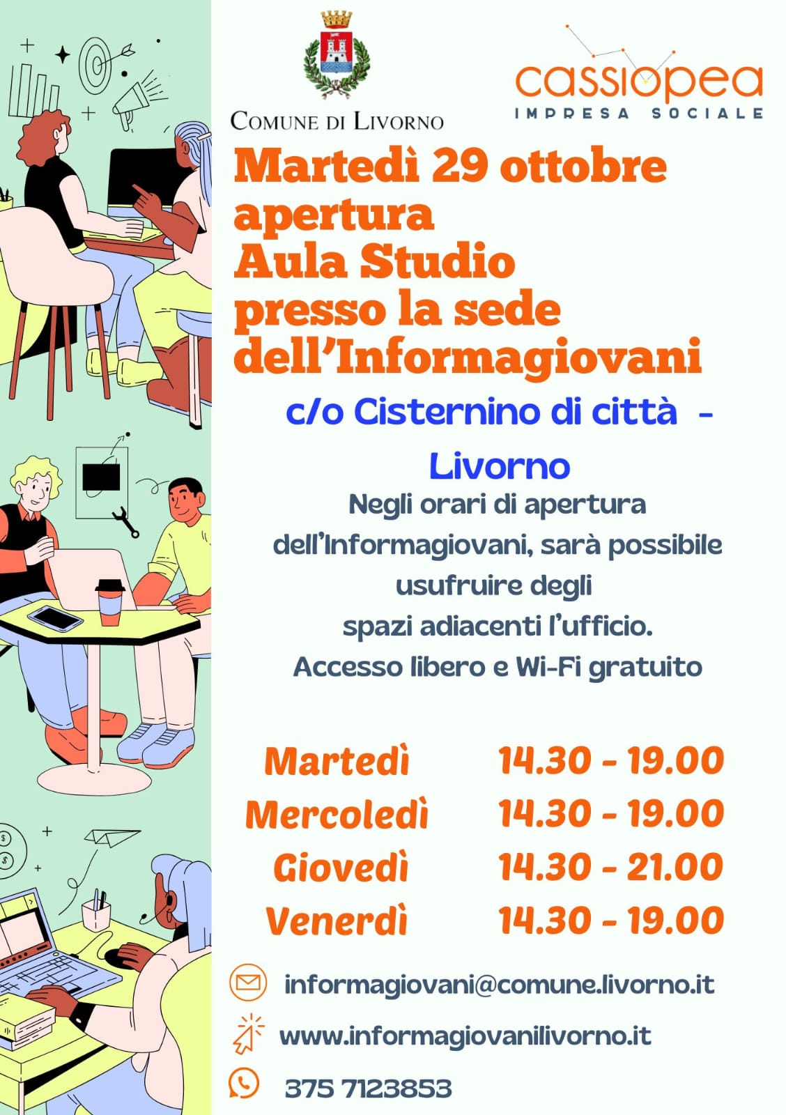 Livorno, 25 ottobre 2024 – Da martedì 29 ottobre gli studenti e le studentesse della città avranno di nuovo, dopo la pausa estiva, l'opportunità di incontrarsi e studiare nell'aula studio presso il Cisternino di Città, dove ha sede, al 1° piano, lo sportello Informagiovani.
