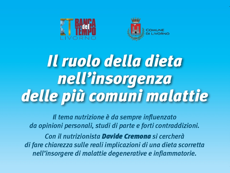 Livorno 4 dicembre 2018 - Giovedì 6 dicembre alle ore 17:30 presso il Cisternino di Città si terrà l’incontro pubblico “Il ruolo della dieta nell’insorgenza delle più comuni malattie” tenuto dal nutrizionista Davide Cremona. L’evento, organizzato da Associazione Banca del Tempo di Livorno in compartecipazione con l’amministrazione comunale, cercherà di fare chiarezza sulle reali implicazioni di una dieta scorretta nell’insorgere di malattie degenerative e infiammatorie.