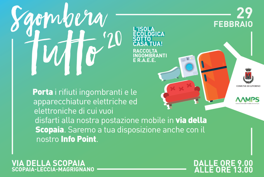 Livorno, 27 febbraio - In arrivo il secondo appuntamento dell’anno con lo Sgomberatutto, l’iniziativa organizzata da Aamps e dall’Amministrazione Comunale di Livorno per venire incontro ai cittadini che vogliono disfarsi dei rifiuti ingombranti ed elettrodomestici di non facile smaltimento.