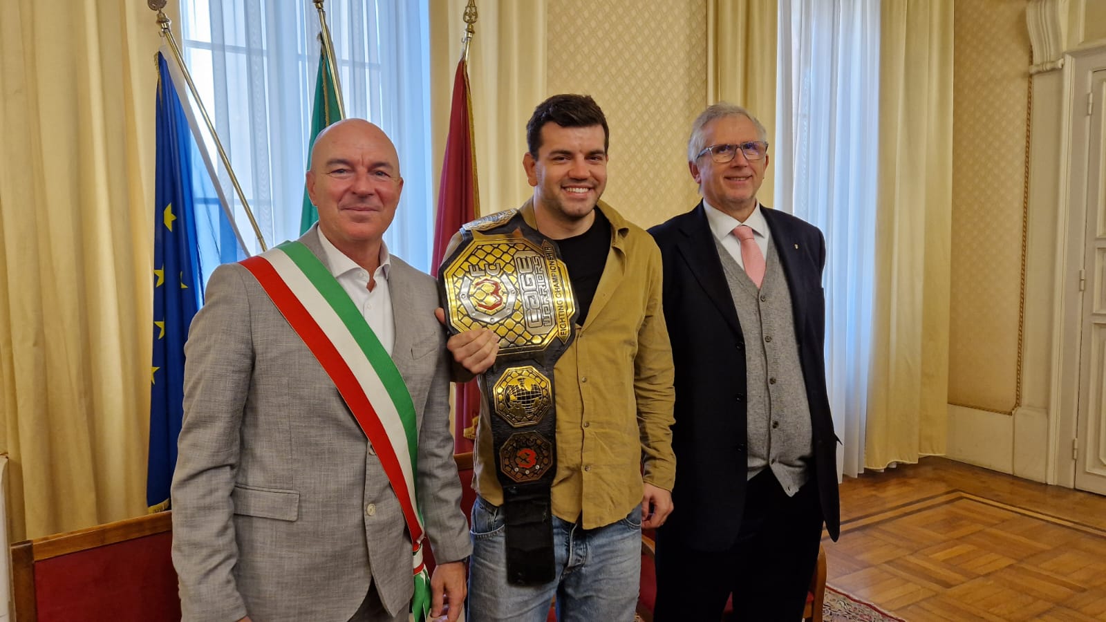 Livorno, 25 gennaio 2024 – Il sindaco Luca Salvetti questa mattina in Sala Cerimonie a Palazzo Comunale ha premiato Dario Bellandi, atleta livornese campione di Mma, donandogli una pergamena per meriti sportivi. Insieme al Sindaco anche Giovanni Giannone presidente provinciale del Coni.
