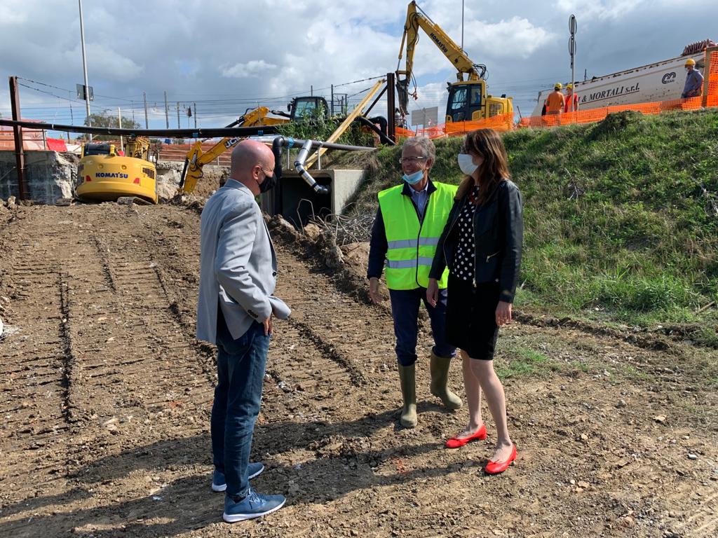 Livorno, 30 settembre 2020 – Sopralluogo del sindaco Luca Salvetti e dell'assessora alla mobilità Giovanna Cepparello in via Mondolfi, all'altezza del ponte, dove, da lunedì, sono iniziati i lavori post-alluvione del Genio Civile della Regione per lo spostamento a valle del punto di immissione del fosso Forcone nel rio Ardenza.