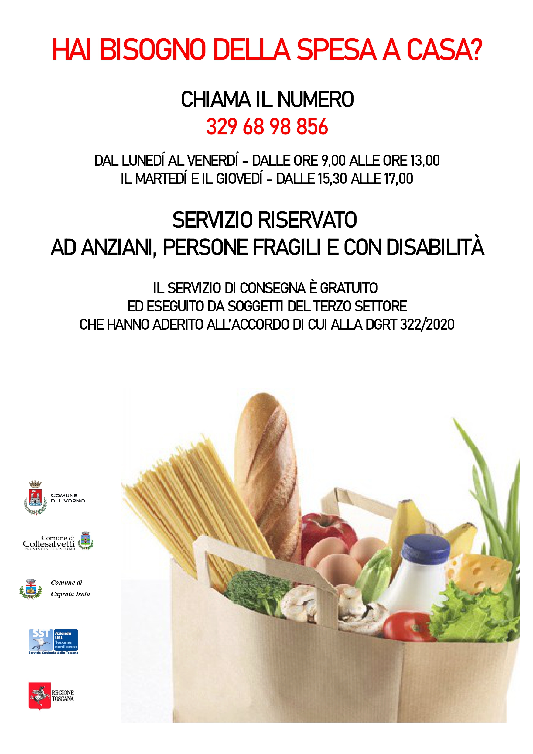 La Zona Distretto Livornese (Comune di Livorno, Collesalvetti e Capraia Isola), grazie anche alle risorse messe a disposizione dalla Regione Toscana per l'emergenza Covid19 (DGRT 322/2020), ha attivato, in via straordinaria, il servizio per la consegna a domicilio di beni di prima necessità, come alimenti, farmaci o altri prodotti essenziali, alle persone anziane,conosciute o meno dai servizi territoriali, che sono invitate a non uscire dalla propria abitazione o che, a causa di precarie condizioni di salute, di autonomia o di solitudine, non possono provvedere autonomamente, non potendo contare su risorse familiari.