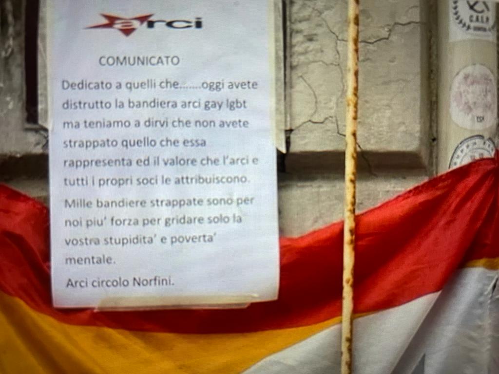 Livorno, 3 giugno 2022 – La bandiera dell'Arcigay esposta al Circolo Norfini a Colline è stata vandalizzata.