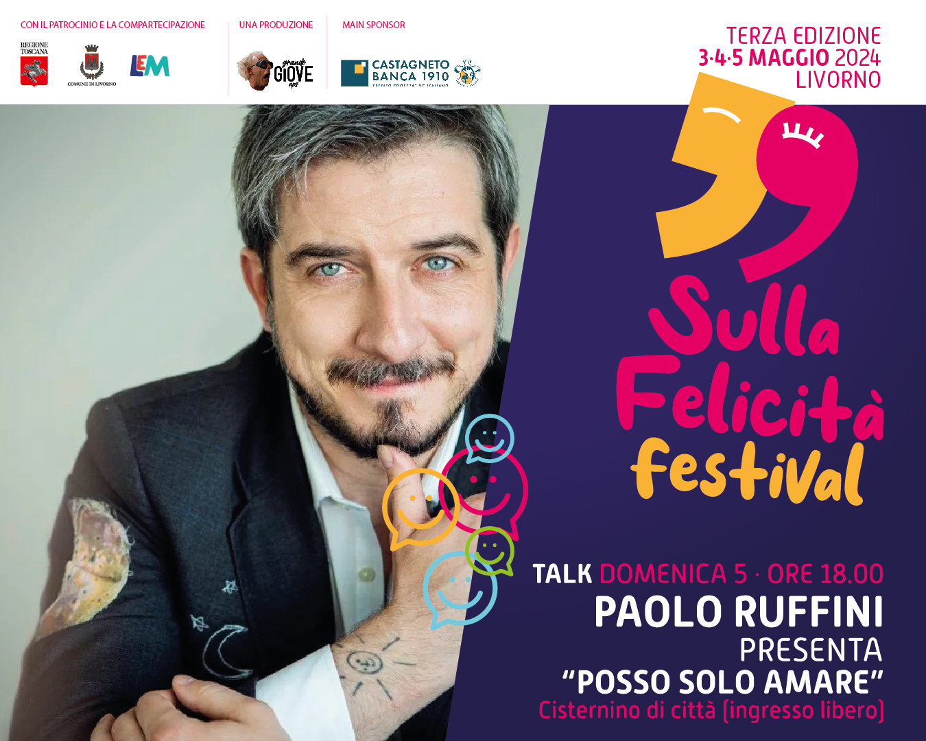 Un viaggio entusiasmante e bellissimo quello di Paolo Ruffini. Attore, autore, regista ma soprattutto “portatore sano di felicità”. Paolo si racconta in un’intervista imperdibile, moderata dall’attrice Daniela Morozzi, aperta e sincera sulla sua carriera e su come abbia raccontato la felicità attraverso il sorriso e le lacrime, dal suo esordio fino all’ultimo libro “Posso solo amare”.