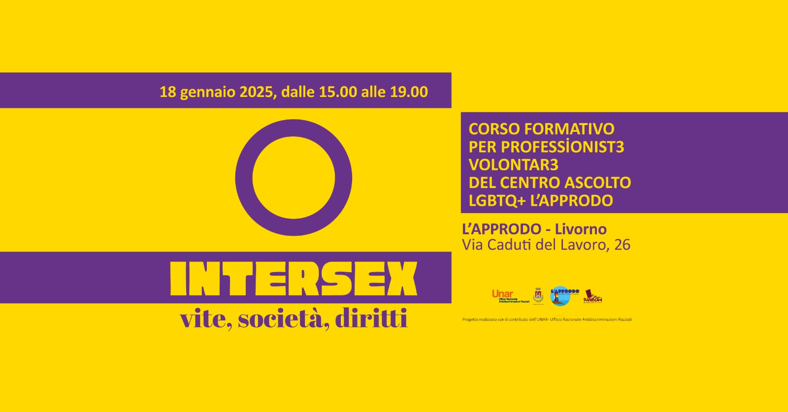 Si svolgerà sabato 18 gennaio, dalle 15 alle 19, al Centro Ascolto LGBTQ+ L'Approdo un seminario formativo sulla tematica intersex. L'iniziativa è aperta a tutta la cittadinanza. Il corso si propone di fornire informazioni per il corretto inquadramento e per la presa in carico di persone intersex dall’età evolutiva all’età adulta e delle loro famiglie.