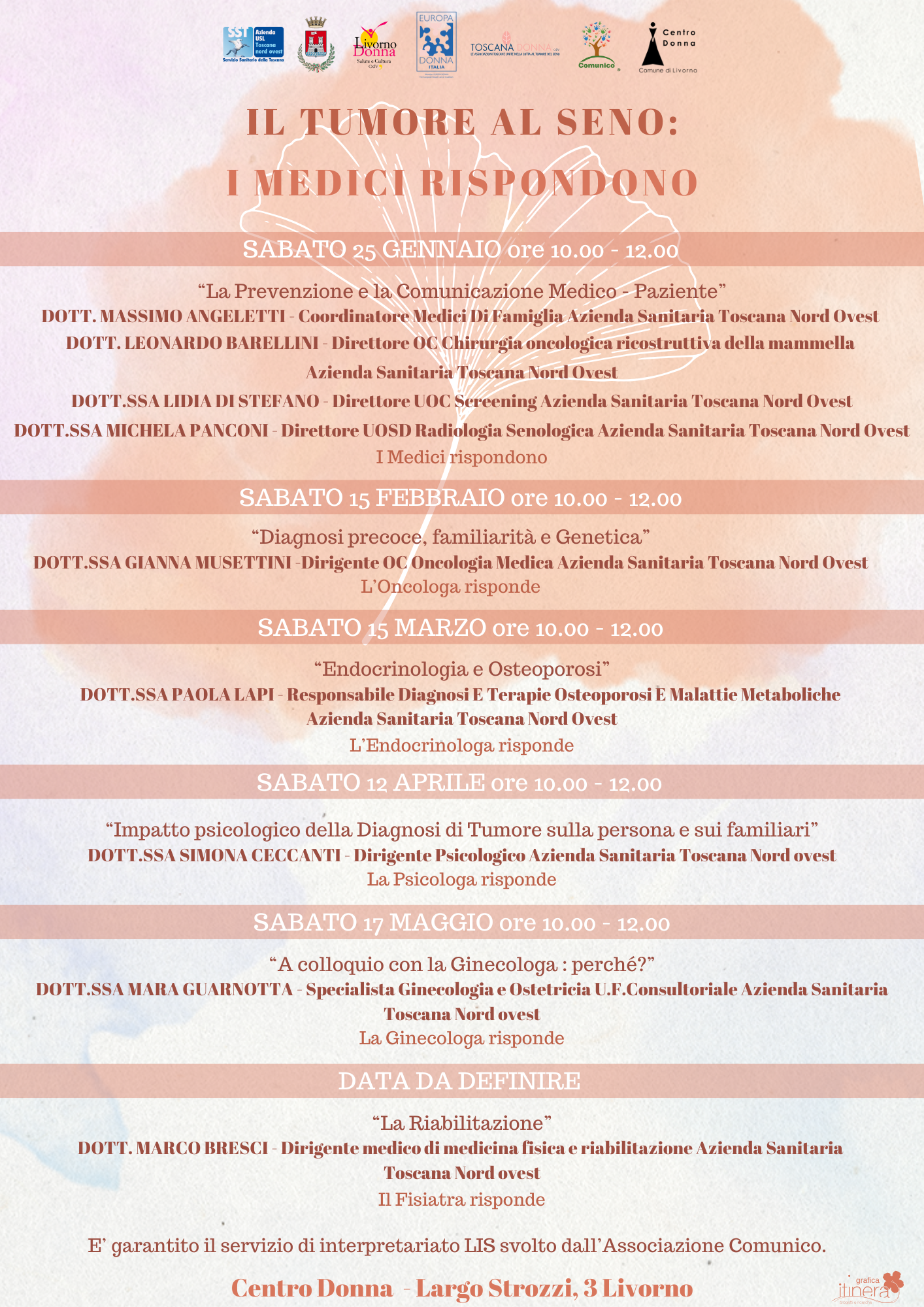 L'Associazione Livorno Donna Salute e Cultura E.T.S. nell'ambito delle azioni di informazione, prevenzione oncologica e promozione dei corretti stili di vita organizza il secondo ciclo di incontri con i medici dell'Azienda Sanitaria Toscana Nord Ovest dal titolo "Il tumore al seno: i medici rispondono".
