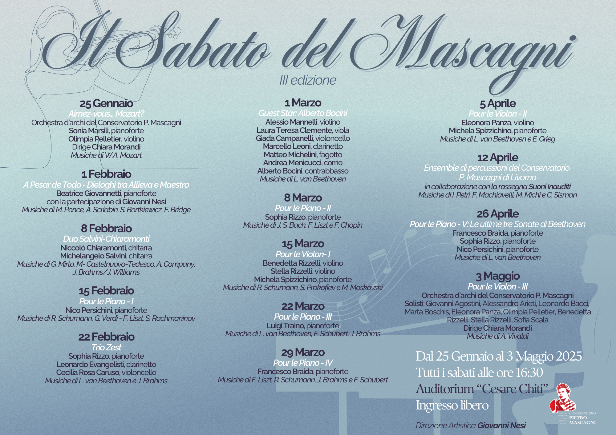 Sabato 25 gennaio alle ore 16.30 all'auditorium Cesare Chiti (via Galileo Galilei, 40) prende il via la terza edizione de "Il sabato del Mascagni", sotto la direzione artistica di Giovanni Nesi, la stagione di concerti dedicata ai migliori allievi del Conservatorio Pietro Mascagni.