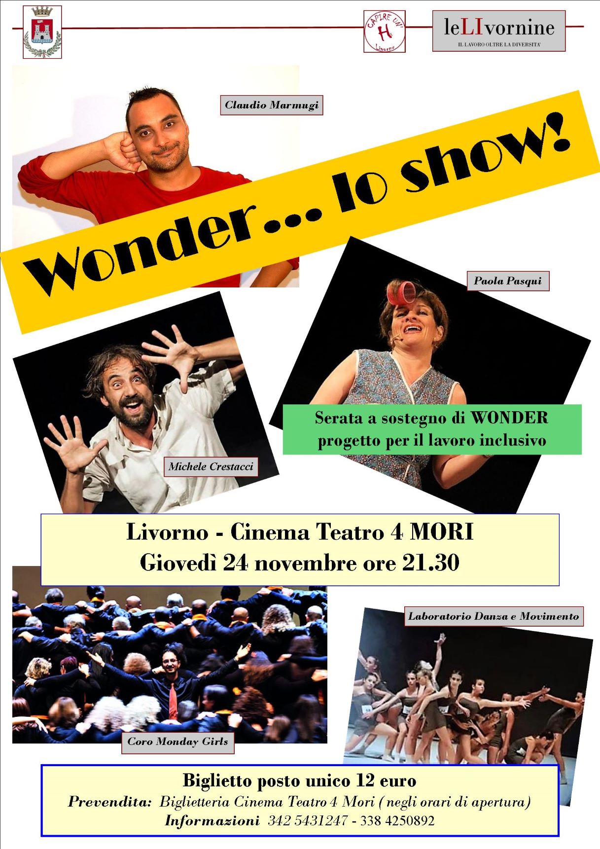 Giovedì 24 novembre alle ore 21,30 al cinema teatro 4 Mori di Livorno va in scena "Wonder... lo show!" spettacolo di varietà per sostenere l'apertura di un locale polivalente e totalmente accessibile, Wonder appunto, nel quartiere Venezia di Livorno per offrire posti di lavoro a persone con disabilità.