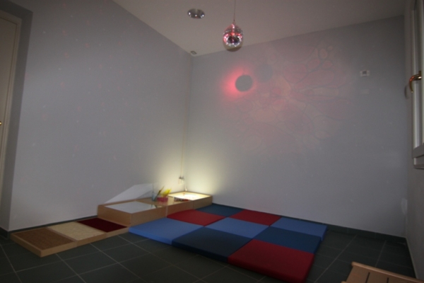 Un breve corridoio, strutturato come collegamento polisensoriale, conduce al terzo ambiente-gioco caratterizzato da un’ampia vetrata sul giardino e da una lunga finestra a nastro sul lato opposto; orientato al gioco espressivo (atelier della grafica, della pittura, della creazione), questo terzo ambiente si apre sul giardino e su un ulteriore ambiente gioco organizzato per i giochi di luce e, in generale, per i giochi sensoriali e percettivi.
