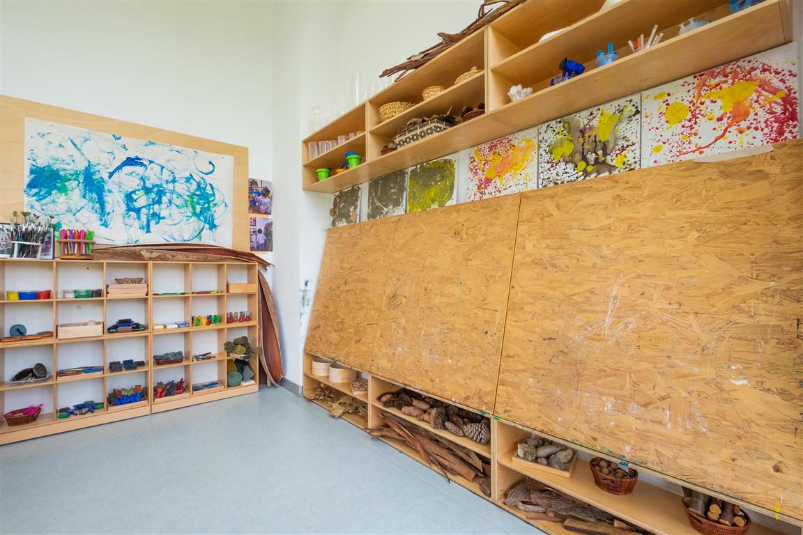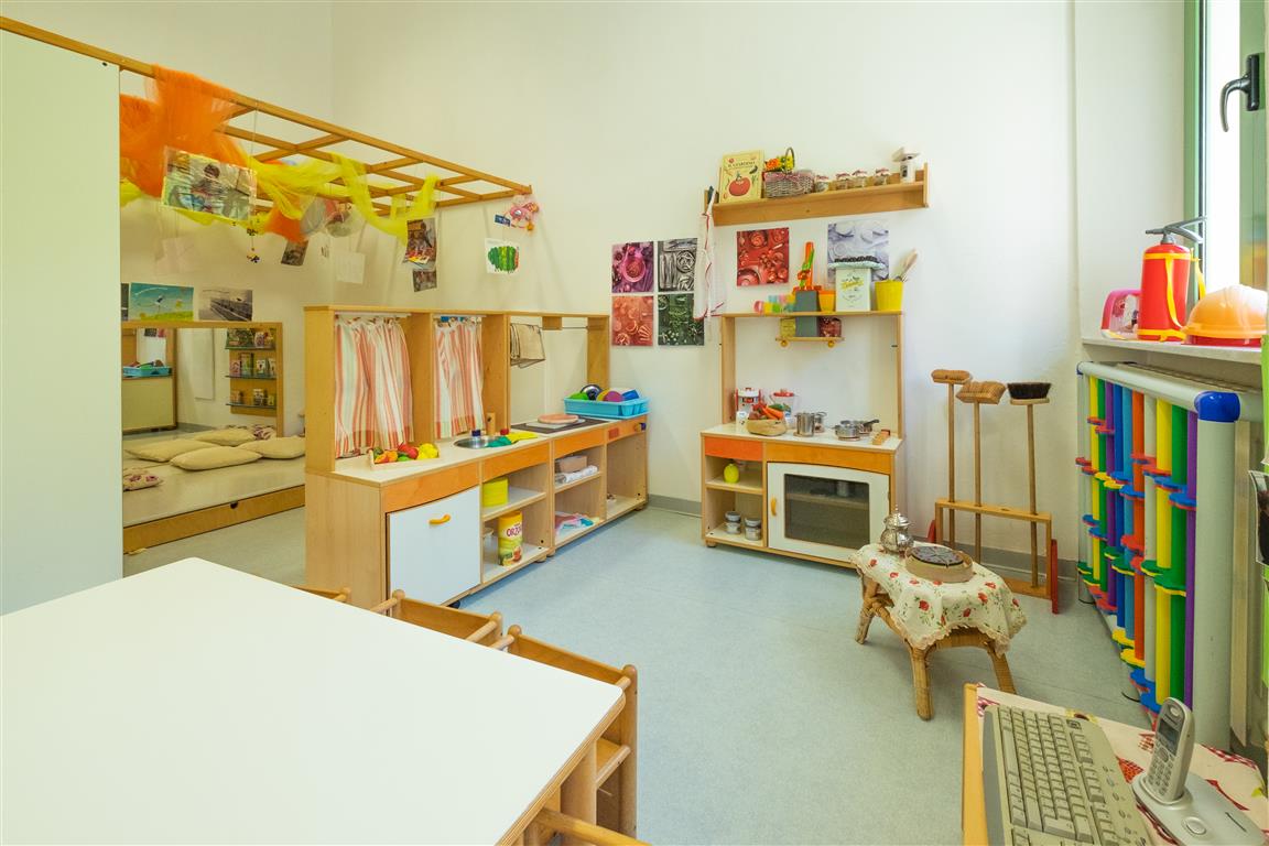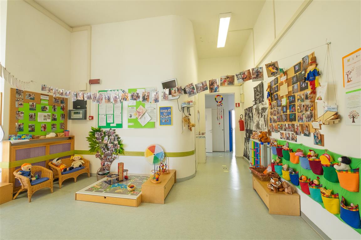 La superficie coperta del Nido ammonta a circa 230 mq e, oltre i servizi, è stata organizzata in quattro ambienti di gioco: uno per l’accoglienza di bambini e genitori (con oggetti e giochi a valenza affettiva); uno per le attività di manipolazione, creazione, grafica e pittura sfruttando l’ampia vetrata del locale che consente giochi di luce e trasparenze; uno per le attività di movimento (motorie e psicomotorie) con pedane (che contengono anche materassini per il riposo) e strutture componibili rivestite di materiale antiurto; uno per il gioco simbolico strutturato come una “minicasa”. Per i giochi all’aperto c’è poi una terrazza di 50 mq. ed un giardino di circa 600 mq. a verde.