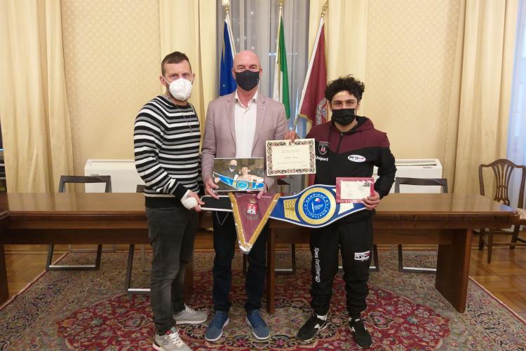 11 Marzo 2021 Il sindaco Luca Salvetti consegna una pergamena al livornese Jonathan Sannino neo campione italiano di pugilato della categoria Supergallo